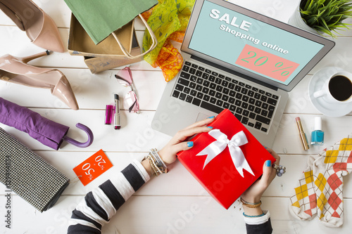 shopping, online shopping, computer, cyberspace, shop, gift, box, present, online, laptop, clothing, woman, dress, hand, purchasing, buying, buy, marketing, card, credit, using, technology, modern, commerce, table, desk, to sit, sitting, young, design, screen, graphic, colours, colourful, home, house, fashion, sale, device, retail, connection, shopaholic, sale, shoe, bag, shirt, foulard