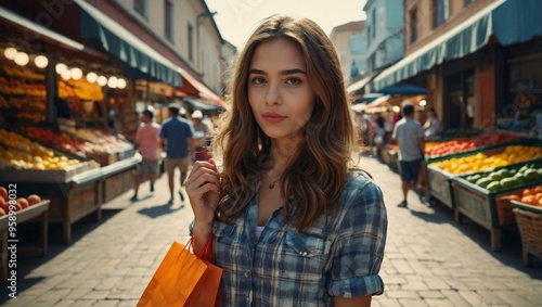 Woman Shopping Young woman shopping at the market, cartoon style.