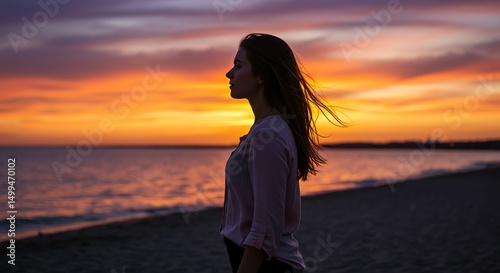 woman, silhouette, racked, dreamy, natural, calm, beach, sunset, sky, cloud, sand, sea, horizon, coast, water, wind, hair, face, profile, pensive, orange, purple, serene, peaceful, warm, dusk, twilight, gold, coastline, shore, travel, inspiration, relaxation, contemplation, scenery