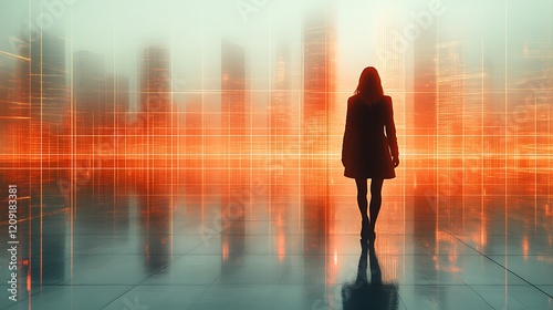 woman, silhouette, city landscape, futuristic, city, building, skyscraper, urban, modern, technology, digital, orange, red, grid, line, fog, mist, atmosphere, ambient, mood, dark, mysterious, lonely, contemplation, future, progress, development, advancement, innovation, vision, perspective, dream, ambition, hope, journey, path, destination, exploration, discovery, standing, coat, leg, shoe, ground, floor, tile