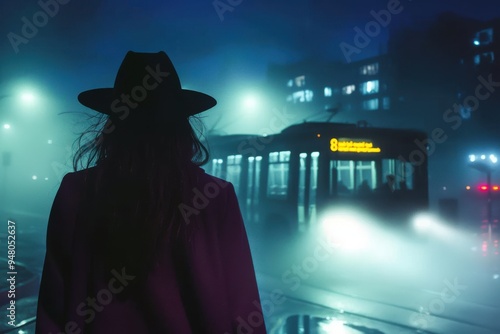 woman, silhouette, night, city, fog, mist, dark, scarey, evening, black, hat, alone, mystery, film, lost, man, skittish, atmospheric, urban, shadow, mysterious, thriller, suspense, gloom, dense, cinematic, enigmatic