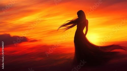 sunset, silhouette, woman, girl, long hair, dress, beautiful, magical, mystical, fantasy, aethereal, romantic, dramatic, fiery, vibrant, colours, sky, cloud, sun, light, art, artwork, digital artwork, painting, illustration, photo, nature, landscape, peaceful, serene, calm, calmness, hope, freedom, spirit, soul, feminine, grace, elegance, beauty, power, strength, inspiration, aspiration, dream, imagination, creative, artistic