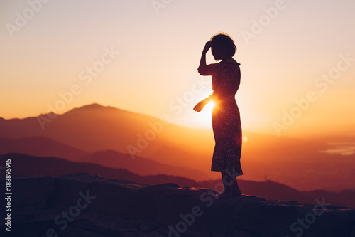 sunset, woman, silhouette, mountain, dress, sun, sky, sea, sunrise, people, nature, summer, young, water, person, couple, cloud, orange, beauty, evening, outdoors, love, landscape, dawn, stunning, light, dusk, red, standing, barefoot beach, serene, 1