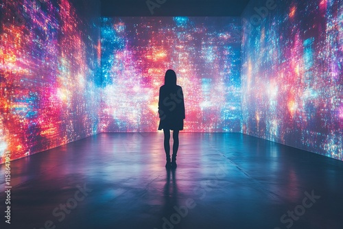 woman, girl, female, person, art, digital, installation, display, screen, technology, future, modern, abstract, colourful, vibrant, light, dark, room, space, wall, floor, silhouette, back, standing, alone, emotion, mood, feeling, mystery, imagination, creativity, innovation, design, concept, visual, graphic, pattern, texture, datum, information, network, connection, energy, power, beauty, aesthetic, surreal, artistic