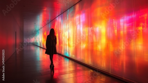 woman, silhouette, back, walking, corridor, wall, light, colourful, illuminated, bright, red, orange, yellow, pink, purple, teal, gradient, glasses, panel, modern, architecture, interior, design, art, installation, abstract, moody, atmospheric, reflective, floor