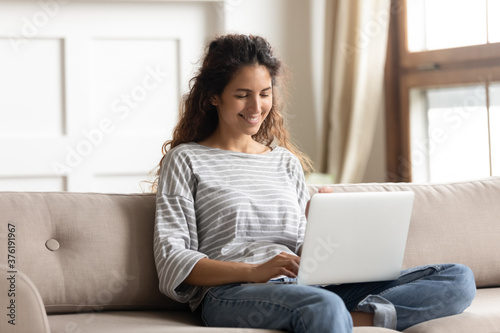 Woman sit on couch in living room put notebook on laps texting e-mail do remote job , happy freelancer enjoy distant job. Buying on-line, discounts offer and sale and easy comfort e-shopping concept