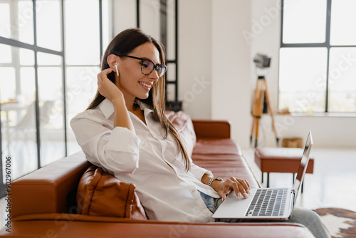 woman sitting on sofa at home relaxed using laptop in white t-shirt and jeans listening to earpods