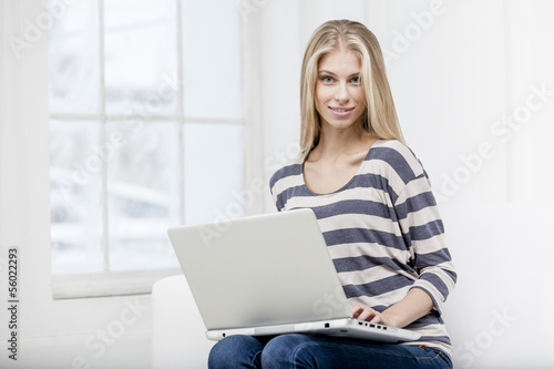 color image, domestic life, happiness, lifestyle, living room, real people, technology, beautiful, blonde hair, casual attire, caucasian, cheerful, communication, computer, copy space, couch, female, holding, horizontal, indoor, cyberspace, laptop, long hair, one person, online, sitting, smiling, sofa, white, woman, young adult