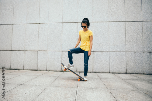 Woman skateboarder skateboarding at city