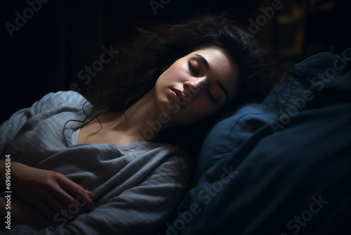 woman sleeping on bed in dark room, blurred background