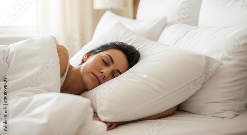 woman, sleeping, sleep, bed, pillow, bedding, white, comfort, rest, relaxation, indoor, bedchamber, morning, peaceful, serene, dark hair, soft light, cosy, deep sleep, rejuvenation, health, wellness, quiet, slumber, dream, resting, face, closeup, adult, female, sheet, duvet, calmness, nap, night time, healthy, routine, to rest, light, bright, clean, domestic, home