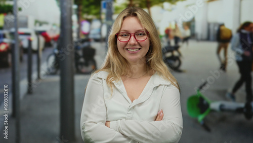 Woman smiling confidently on bustling urban street with blonde hair and red glasses amidst city traffic and blurred pedestrians suggesting a vibrant outdoor setting.