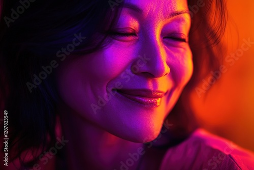 woman, smiling, purple, orange, light, portrait, contemporary, modern style, studio, fashion, emotional, minimalist, intense, creative, energy, trendy, artistic, bright, warmth, happiness, glow, radiance, female, joy, beauty, elegant, serene, tranquil, closeup, personal, intimate, adult, cheerful, illuminated, facial expression, positive, gentle, copy space