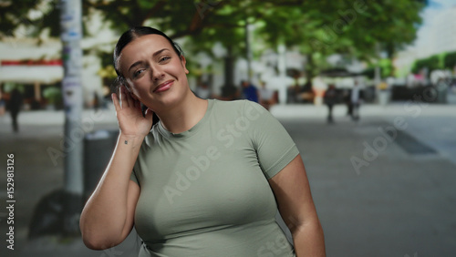 woman, smiling, city, street, urban, people, tree, vibrant, scene, happy, curvy, plus, size, young, fashion, leisure, confident, modern, expression, daylight, casual attire, lifestyle, interaction, face, clothing, cheerful, attractive, hair, photo, background, environment, natural, public, candid, outfit, expressive, city landscape, friendly, gesture, mood, fashionable, sunlight, relaxed, daytime, sightseeing, travel, summer
