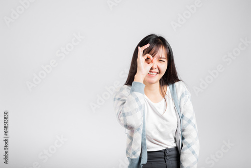 Woman smiling showing made finger OK symbol sign to agree studio shot isolated white background, Happy Asian portrait beautiful young female lifestyle agree hand sign with copy space