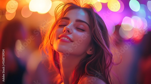 woman, girl, female, smiling, happy, joyful, face, portrait, light, colourful, vibrant, neon, party, night, club, dancing, music, people, crowd, background, bokeh, blurred, closeup, beauty, pretty, attractive, model, fashion, style, hair, long, wavy, skin, make-up, expression, emotion, feeling, mood, positive, energy, nightlife, entertainment, fun, celebration, event, scene, image, photo