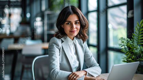 Woman smiling while working on a laptop in a bright and modern office environment
