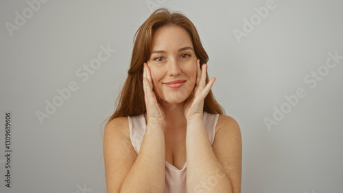 Woman smiling with hands on face against isolated white background, showcasing attractive redhead adult with a friendly expression.