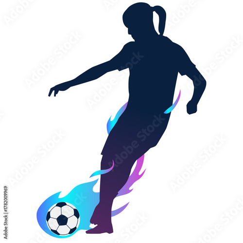 woman, girl, female, soccer, football, silhouette, kicking, ball, sport, abstract, graphic, design, gradient, colourful, vibrant, digital, icon, vector, illustration, athlete, action, competition, game, goal, player, team, champion, league, movement, fitness, health, pitch, field, exercise, active, power, strength, performance, background, element, logotype, symbol, stylish, modern