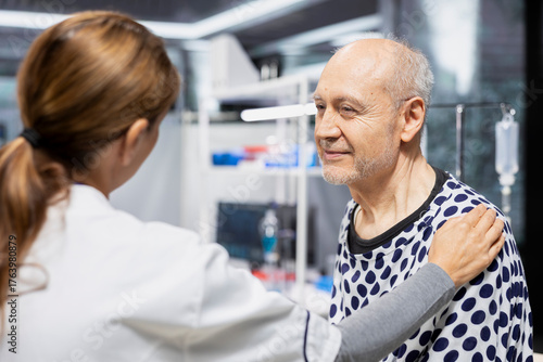 Woman specialist reassuring and bonding with senior patient in research lab, showing empathy for encouragement. Placing her hand on him for affection, safety and prevention study.