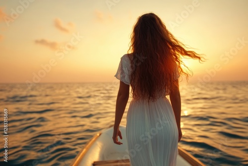 woman, standing, pier, watching, sunset, ocean, beach, sea, horizon, serene, peaceful, dress, flowing, hair, wave, water, summer, vacation, calmness, dawn, dusk, sun, silhouette, nature, travel, relaxation, solitude, scenic, evening, romantic, meditation, freedom, sky, backlit, gold, sunshine, contemplation, calm, escape, dreamy