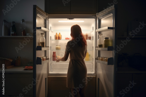 woman standing in front of open fridge, cinematic night lighting. Generative Ai
