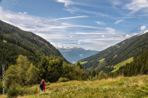 Woman standing on a footpath with a magnificent view - view from behind