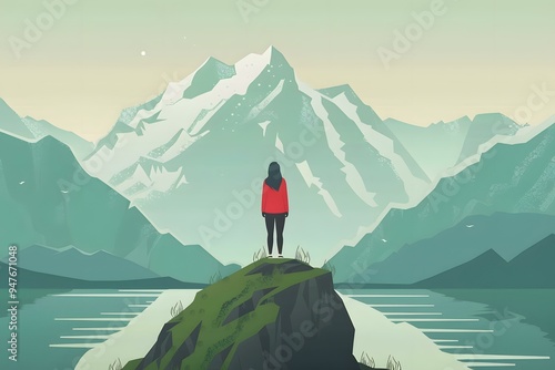 woman, mountain, peak, snow, landscape, nature, illustration, art, sky, water, lake, view, female, silhouette, standing, green, summit, rock, hill, adventure, travel, minimal, flat, design, graphic, style, digital