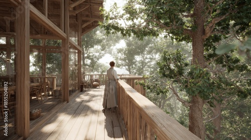 Woman standing on a wooden deck of a wooden house. the deck is surrounded by trees and greenery, and the sky is visible through the trees.