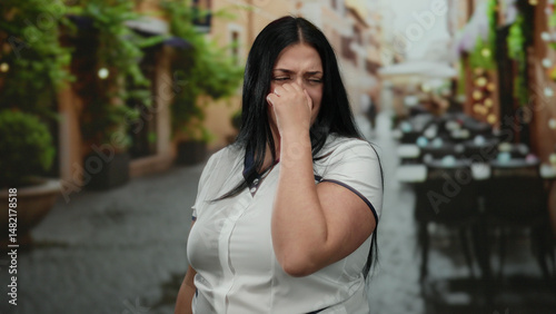 Woman standing on terrace of outdoor restaurant appearing displeased by unpleasant smell in atmosphere featuring lush greenery and cozy ambiance during daytime setting.
