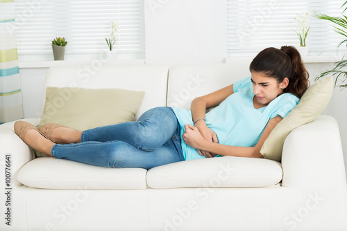 Woman Suffering From Stomach Ache Lying At Home