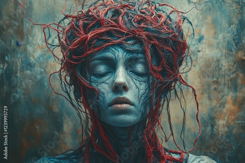 woman, hair, blue, skin, surreal, fantasy, art, portrait, grunge, background, female, model, face, eye, closed, red, texture, mystical, mysterious, magical, aethereal, dreamlike, skittish, gothic, dark, artistic, creative, beauty, unique, unusual, strange, weird, captivating, alluring, intense, dramatic, expressive, emotion, mood, style, image, photo, picture