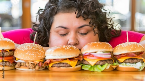 Woman surrounded by hamburgers experiencing food fatigue