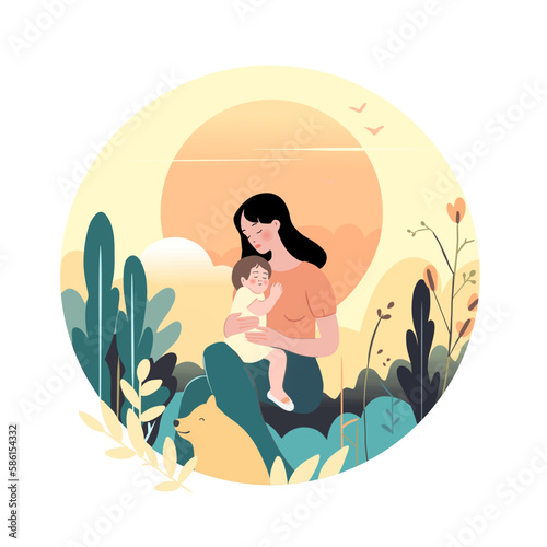 Woman together with child. Vector illustration for Mothers day with hugging mom, small kid, leaves and flowers. Beautiful design with sun in background