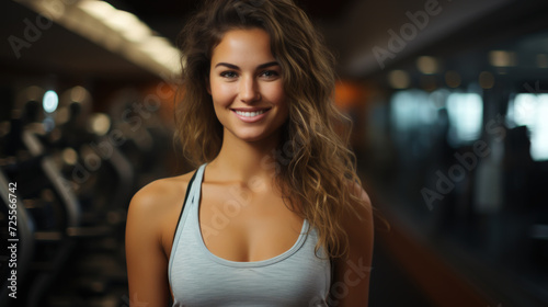 Woman trainer smiling at fitness gym abstract background. Generative ai.