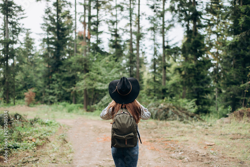 woman traveler, looking at the amazing forest, the concept of travelers travel, the place for the text, the atmospheric epic moment