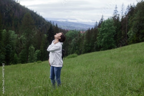 Woman traveler standing on a glade high in the mountains in front of forest, space for text, atmospheric epic moment