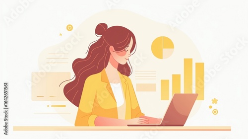 woman, typing, laptop, icon, chart, datum, white, background, aesthetic, visual, professional, art, work, computer, woman, business