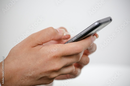 woman typing on a cell phone key in everyday social networks.
