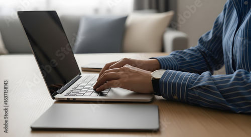 laptop, typing, woman, computer, work, table, keyboard, technology, business, office, desk, indoor, cyberspace, screen, wood, workspace, modern, digital, device, communication, electronic, online, portable, personal, workplace, job, education, learning, connection, lifestyle, student, studying, home, sofa, furniture, blur, background, casual attire, closeup, corporate, employee, finger, hand, notebook, silver, wooden