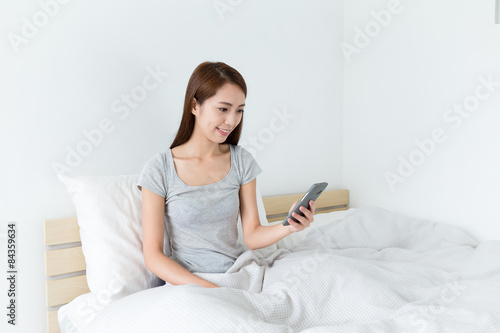 mobile, phone, mobile phone, phone, smartphone, read, look, check, electronic mail, information, lay, down, lying, message, text, screen, condensed, datum, work, woman, lady, girl, female, japanese, korean, chinese, asia, asian, china, mandarin, bed, room, bedchamber, living, interior, sleep, relax, home, house, bedtime, white, pillow, comfort, careless, rest, mattress, morning, to sit, smile, happy