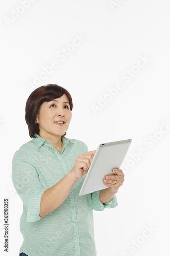 holding, standing, smiling, color image, half face, isolated, idea, japanese, individuality, femininity, communication, connection, technology, cheerful, portability, leisure, hobby, happy, happiness, individual, feminine, asian, japan, wireless, woman, mature, asian ethnicity, japanese ethnicity, mature woman, one person, cut-out, casual clothes, adults only, studio shot, lifestyle