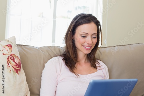 woman, female, caucasian, house, home, sitting, brown hair, brunette, lifestyle, leisure, domestic life, beautiful, pretty, attractive, casual attire, smiling, happy, looking, touch screen, using, tablet, relaxation, comfortable, living room, sofa, couch, indoor