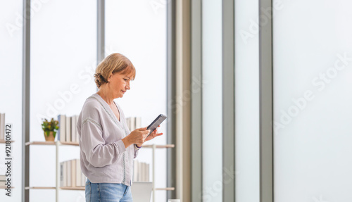 Woman using digital tablet holding digital tablet standing in living room, Caucasian woman using mobile smartphone in the living room