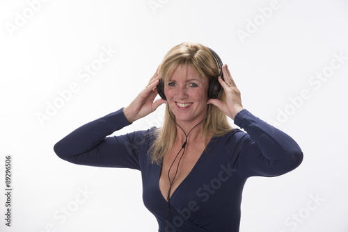 woman, female, listen, listening, headset, earphones, can, adjusting, hearing, sound, device, head, hand, blond, blond, attractive, portrait, dj, disc jockey, working, smiling, audition, holding