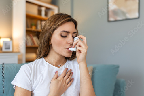 Woman using inhaler while suffering from asthma at home. Young woman using asthma inhaler. Close-up of a young woman using asthma inhaler at home.