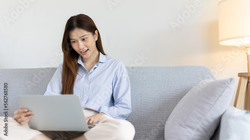Woman using laptop to work or do homework at home with smiling face in her living room, Creating happiness at work with a smile, Live performance or video call with laptop, Work from home.