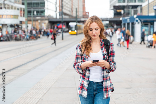 woman, using, smartphone, city, berlin, german, copy space, technology, 1, people, travel, communication, adult, online, female, mobile, phone, walking, holding, travelling, lifestyle, urban, connection, excursion, rail, big, outdoors, checked, watching, looking, casual attire, tramway, journey, wireless, message, break, alexanderplatz, stop, square, commuter, traveler, tram, holiday maker, chat, texting, checking