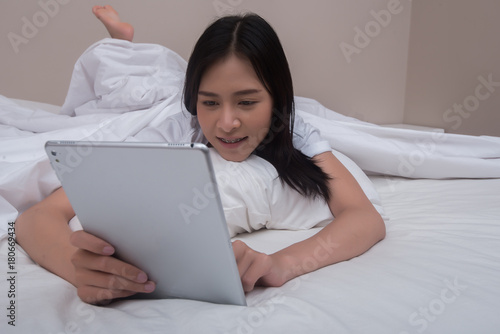 tablet, bed, woman, using, young, person, beautiful, white, 1, indoor, asian, beauty, cyberspace, lying, happy, female, home, cute, attractive, pretty, smile, lady
