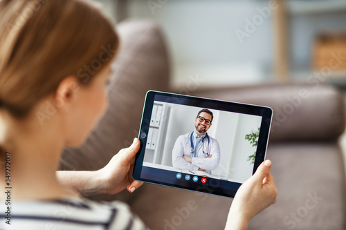 Woman using tablet to speak with doctor.